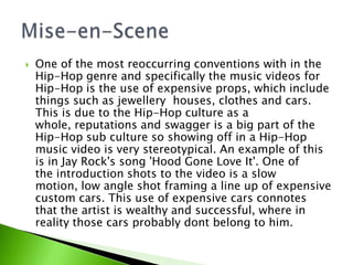 Hip-hop music videos commonly feature expensive props like jewelry, clothes, and cars to portray wealth and success. This convention stems from hip-hop culture where reputation and "swagger" are important. For example, Jay Rock's "Hood Gone Love It" video shows a slow-motion shot of custom cars. Artists also commonly wear expensive clothing and are shown in mansions or driving luxury cars to establish their image as wealthy icons who have achieved success through hard work. Music video conventions help audiences recognize genres and understand the artist's image and lyrics.