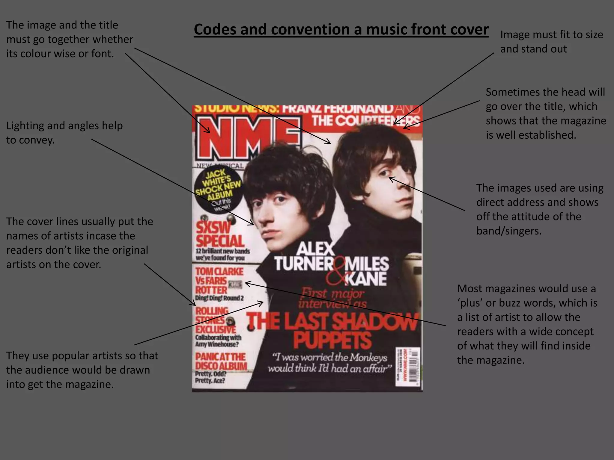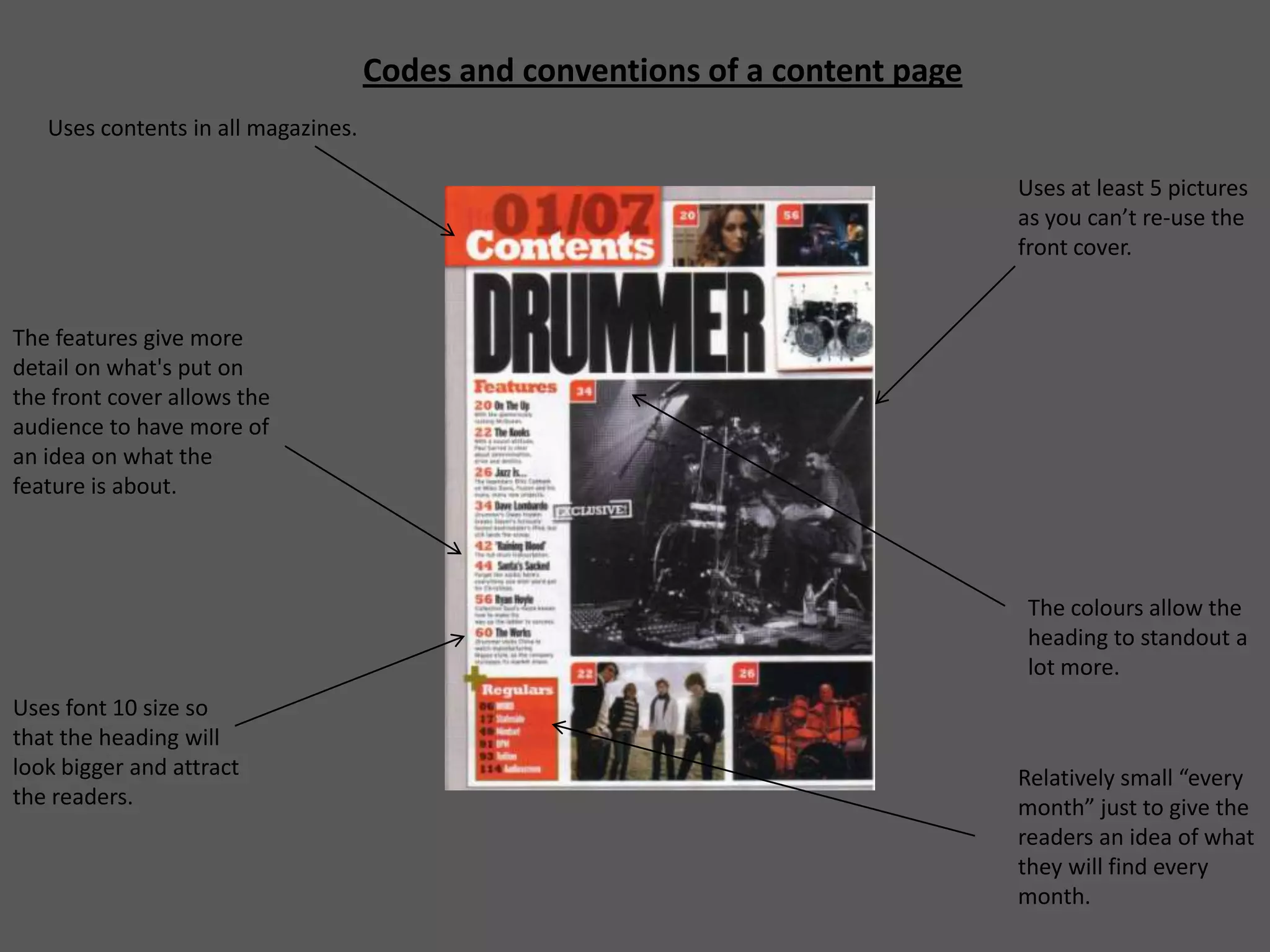 This document summarizes some key codes and conventions for magazine design and layout. It discusses elements like using popular artist images on the cover to draw in readers. The contents page includes at least 5 pictures and headings in a large font size. Double page spreads typically feature a large grabbing image along with a quote to preview the article. Design elements like font size, color, and language are tailored for the target audience and genre. Overall the document outlines visual and written techniques magazines use to effectively engage and inform readers.
