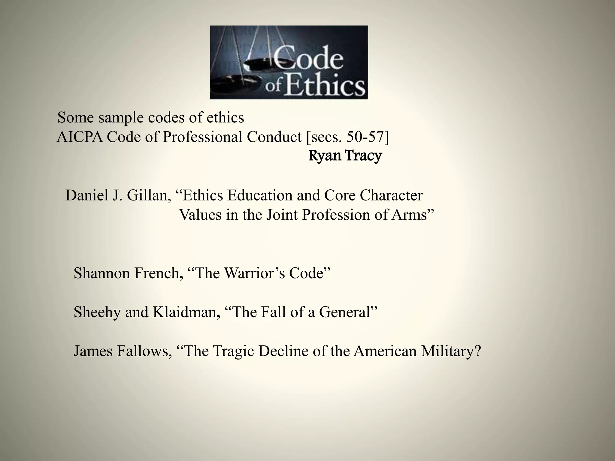 This document lists several codes of ethics and related works that express and regulate professional integrity. It includes the AICPA Code of Professional Conduct, an article on ethics education and core values in the military by Daniel J. Gillan, Shannon French's work "The Warrior's Code", a book by Sheehy and Klaidman called "The Fall of a General", and an article by James Fallows called "The Tragic Decline of the American Military?".