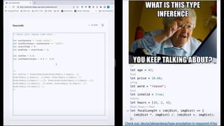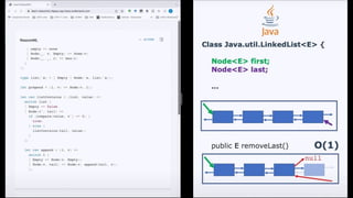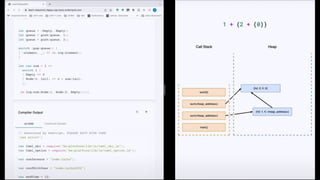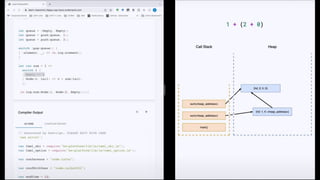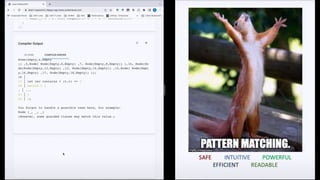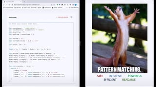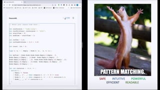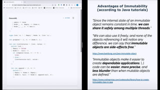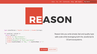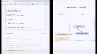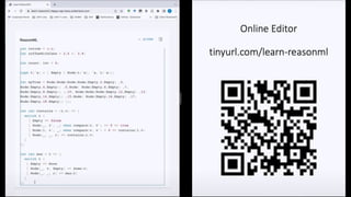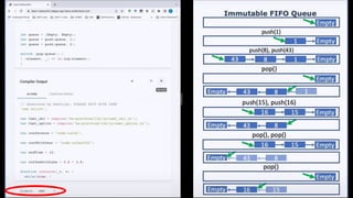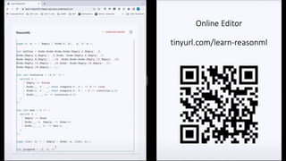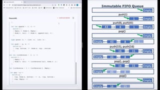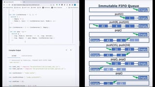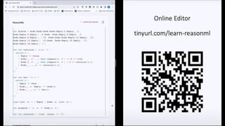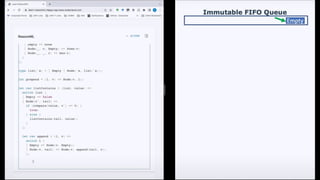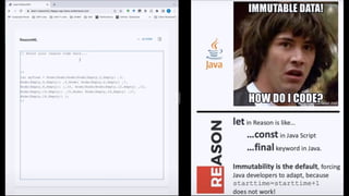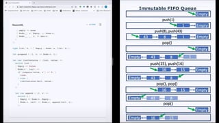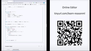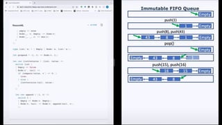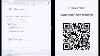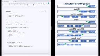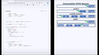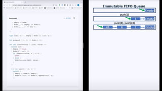 The document discusses efficient functional programming with Reason, focusing on data structures and operations like inserting and popping values from lists. It introduces tail recursion and its transformation into a while loop for constant stack size, as well as the continuation-passing style pattern. Additionally, it directs readers to try Reason on the resonml.github.io website.