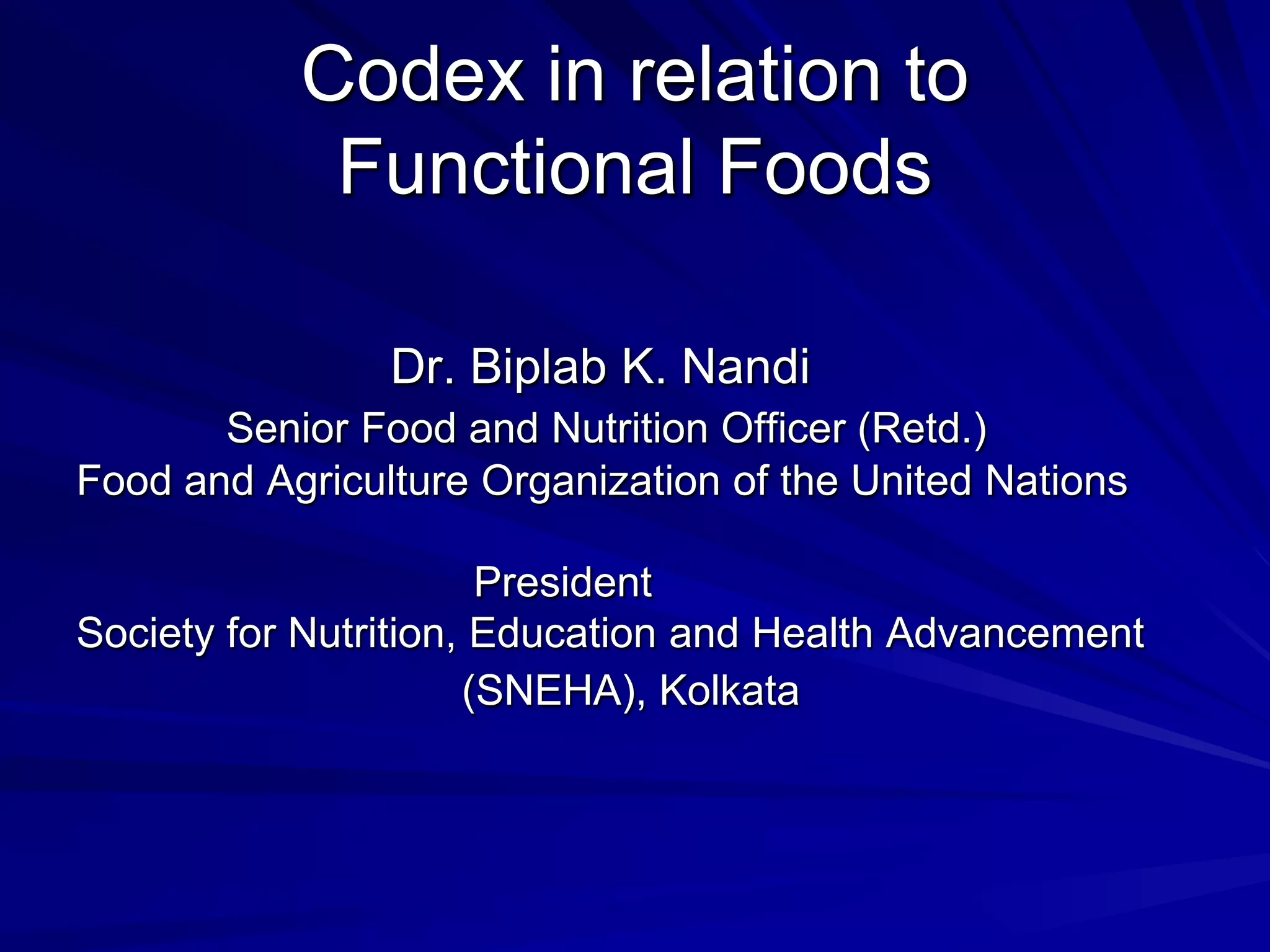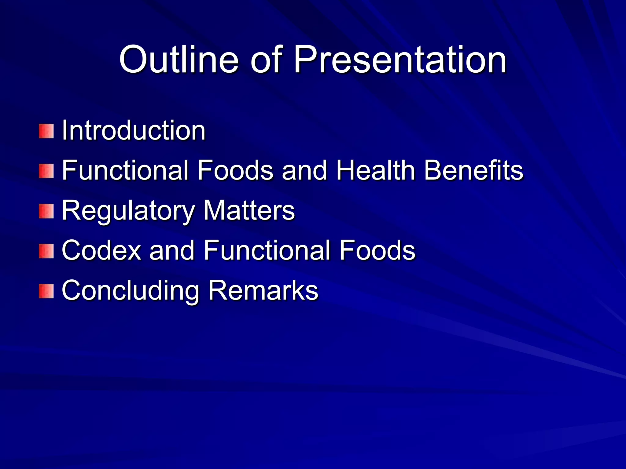 Codex provides guidance on nutrition and health claims for foods but does not have a definition or standards specifically for functional foods. [Codex recognizes the need for coordination on functional foods and held early discussions and workshops on topics related to safety, scientific evidence, and consumer issues.] Codex guidelines indicate that only nutrition claims relating to energy, major nutrients, fiber, sodium and vitamins/minerals are permitted, and set standards for nutrient content claims and reduction of disease risk claims. National authorities are responsible for regulating functional foods in their markets based on Codex guidance.