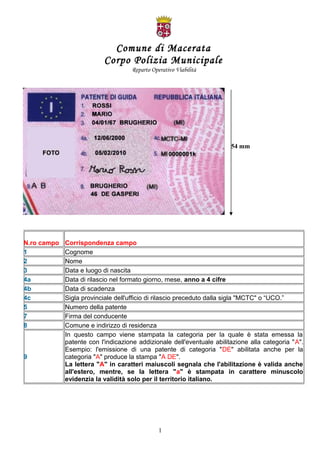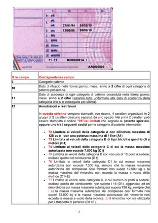 Il documento descrive le procedure e i codici per l'emissione e la registrazione delle patenti di guida in Italia, evidenziando le informazioni essenziali come i dati del conducente, le categorie di patente e le eventuali limitazioni. Dal 21 giugno 2000, sono adottati codici e sub-codici armonizzati a livello europeo per garantire la compatibilità delle patenti nei vari paesi membri. Inoltre, viene sottolineata l'importanza di specificare gli adattamenti per conducenti con esigenze particolari e le relative responsabilità delle commissioni mediche e delle autorità competenti.