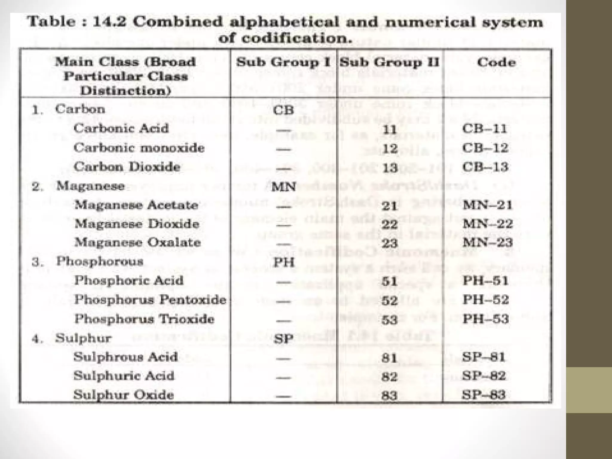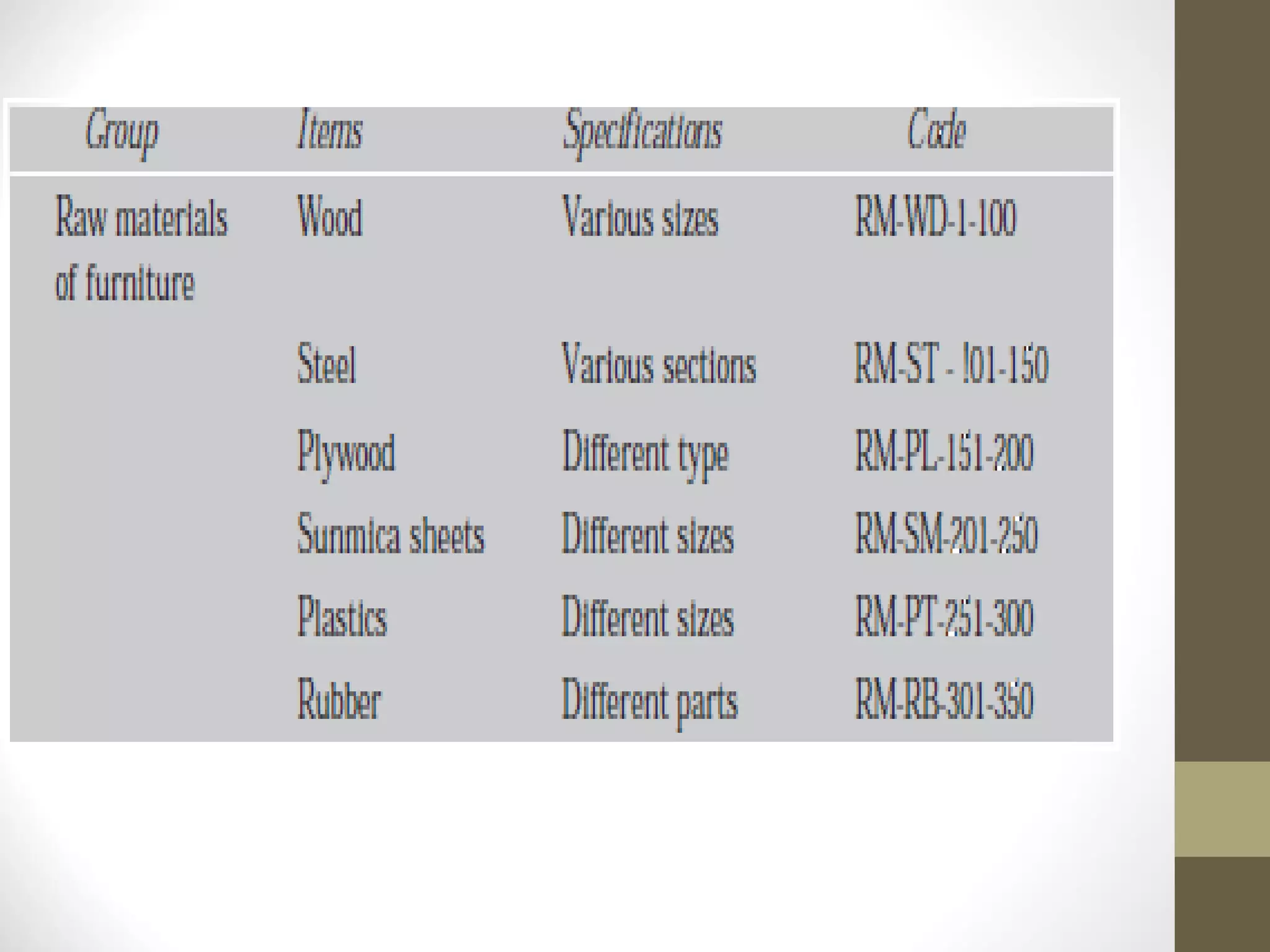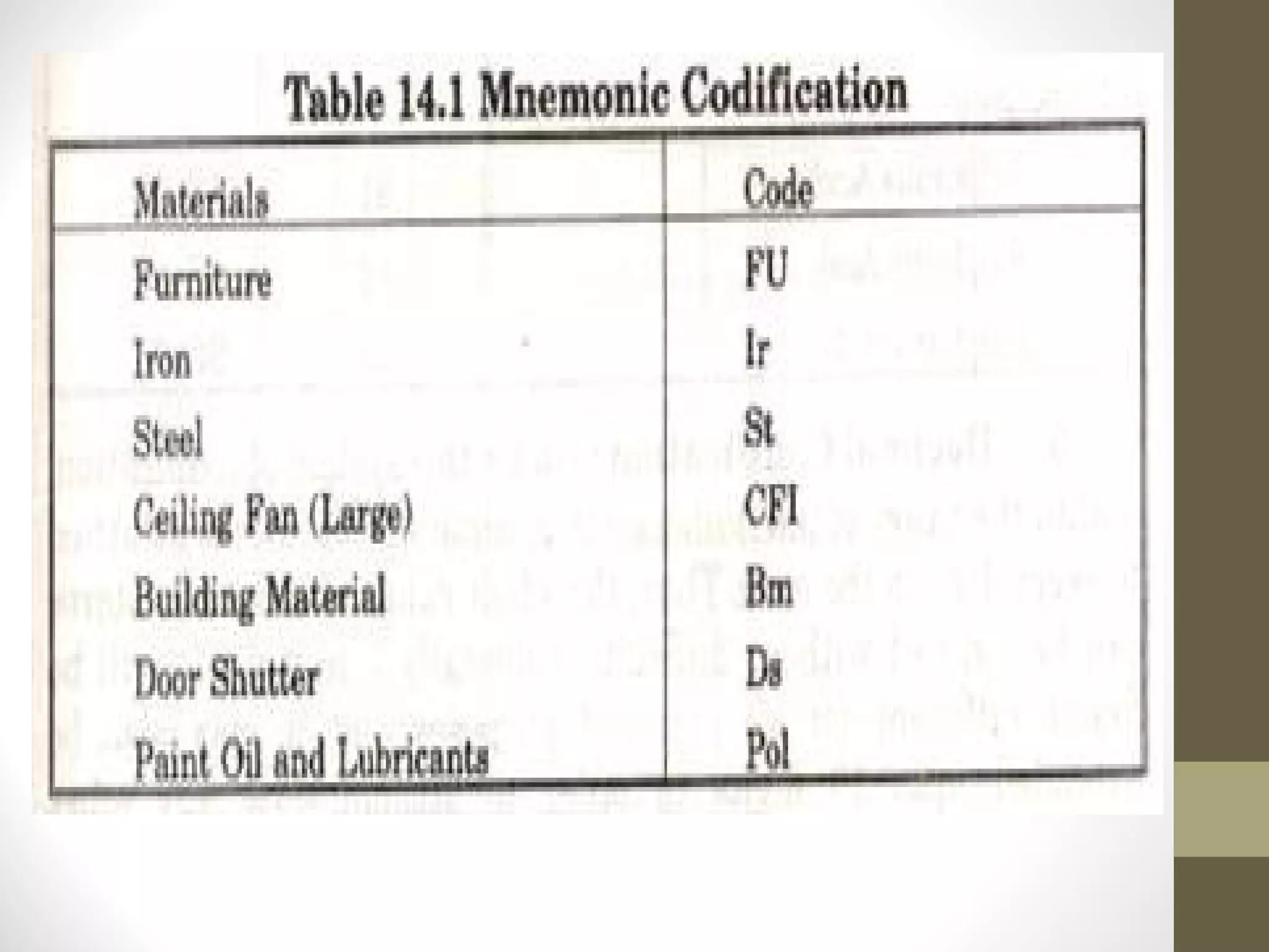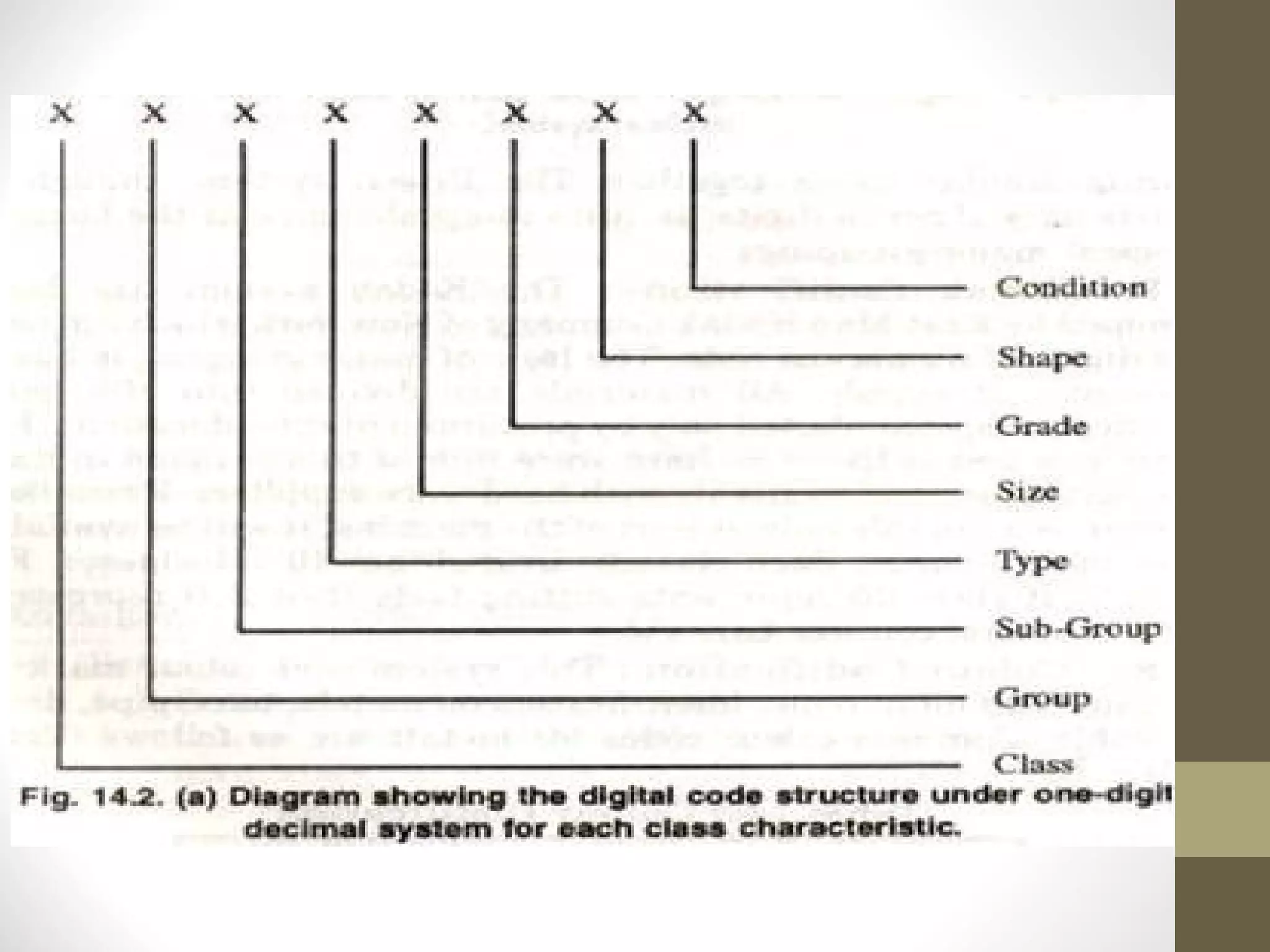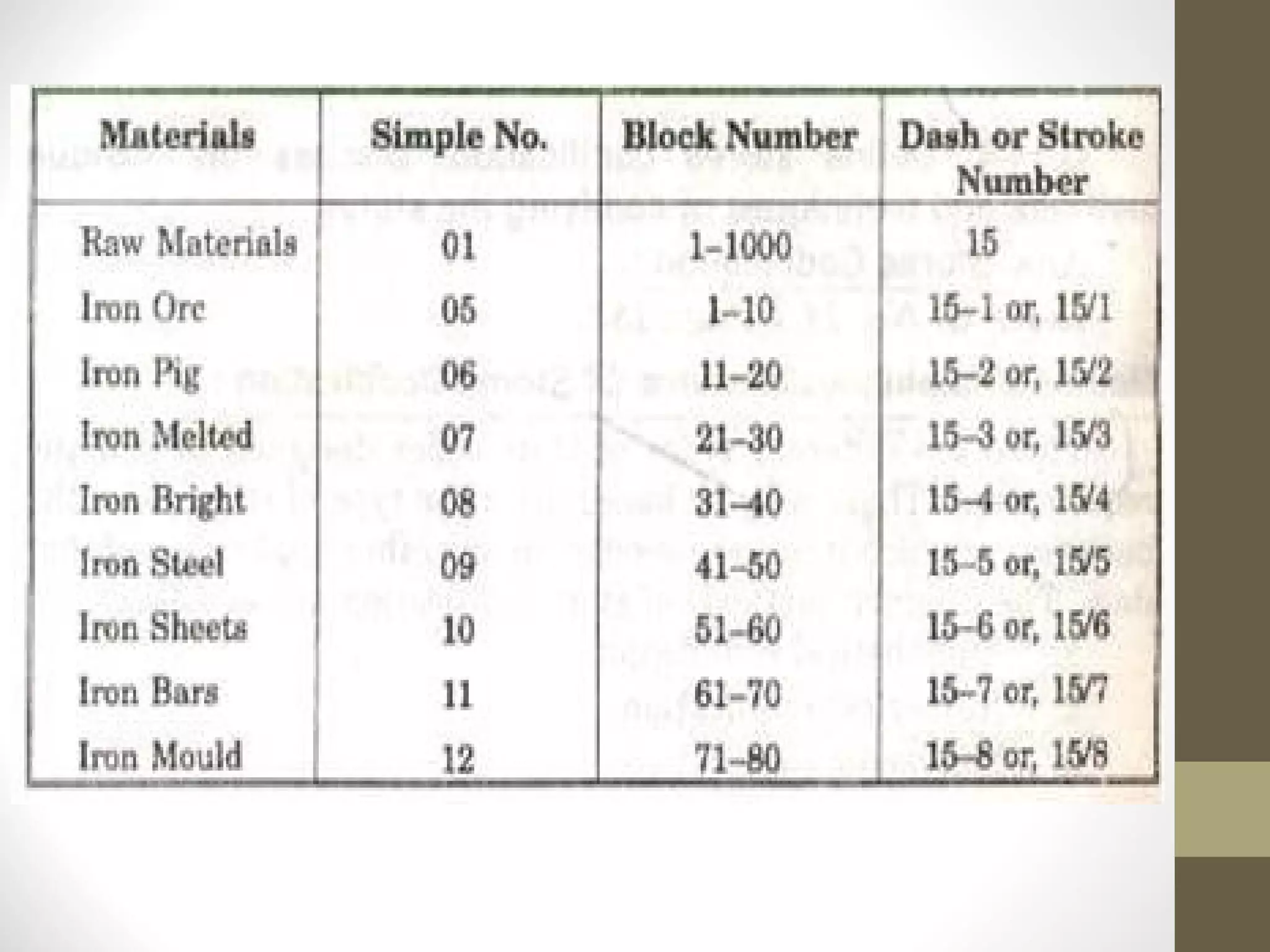This document discusses codification systems for organizing materials in industries. It defines codification as representing equipment, materials, tools, and other items with abbreviated codes using letters, numbers, colors, or symbols. The objectives of codification are accurate identification, standardization, prevention of duplication, efficient purchasing, and computerization. Common codification methods described include alphabetical, numerical, mnemonic, combined alphabetical-numerical, decimal, British, Kodak, and color coding systems. Benefits of codification include accurate identification, simplified purchasing and inventory processes, and enabling computerization.