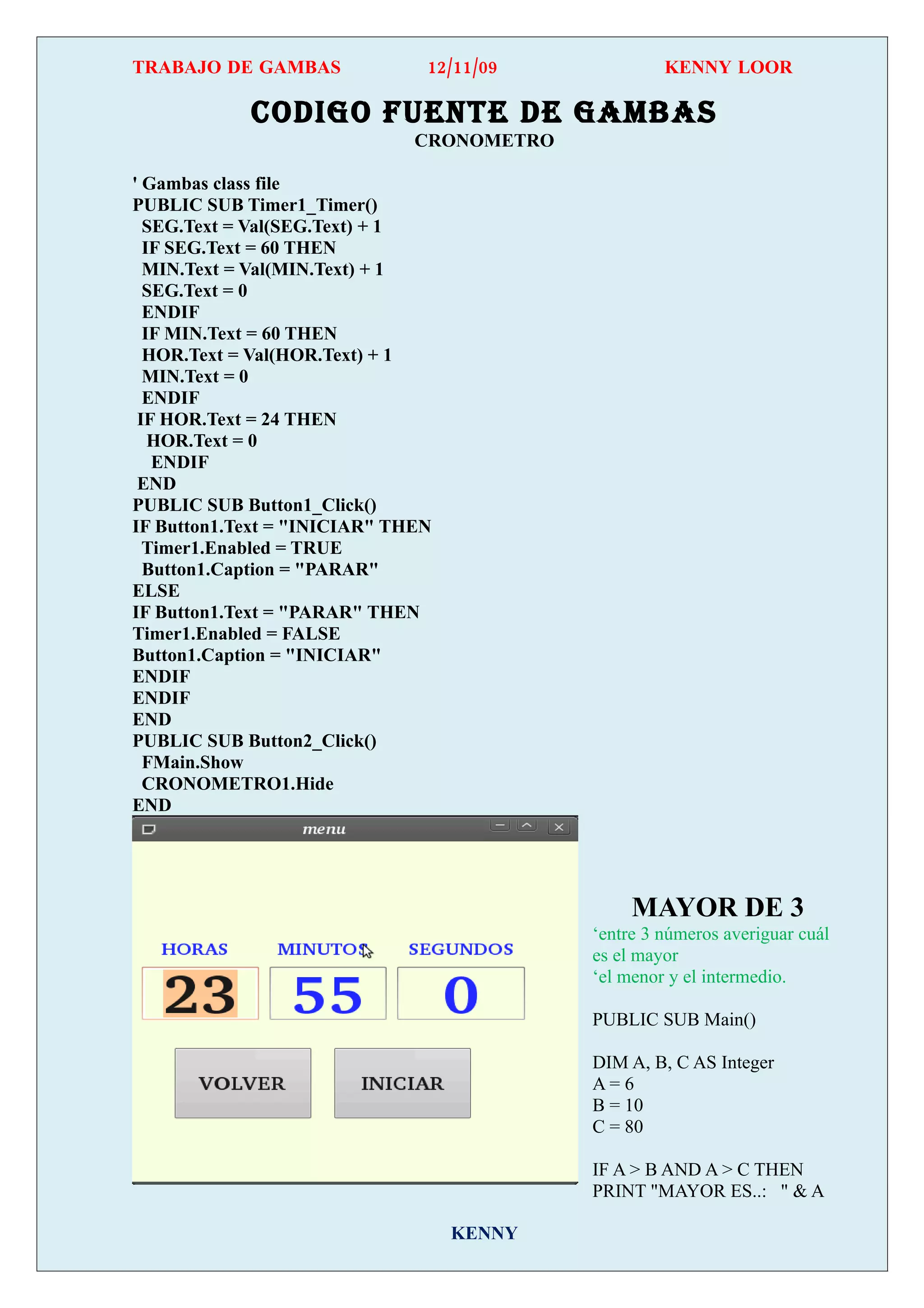 This document contains code snippets and descriptions in Spanish related to programming in Gambas. It includes examples of creating a timer, finding the largest of three numbers, calculating export percentages, Fibonacci series, object-oriented programming with classes like Superhero and Vehicle, and basic graphical drawing. The document was created by Kenny Loor on November 12, 2009 and contains code examples for learning and practicing programming concepts in Gambas.