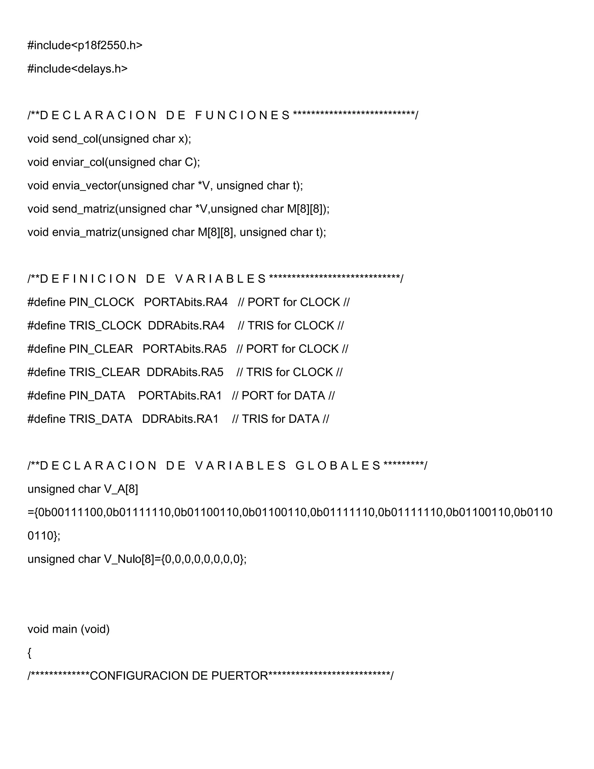 This document contains code for displaying a matrix on an 8x8 LED display using a PIC microcontroller. It includes function definitions to send individual columns of data, send a vector to the display by forming it into a matrix, and send the entire matrix to the display. The main function initializes ports, declares some global vectors, and calls the functions to continuously display one vector then clear the display.