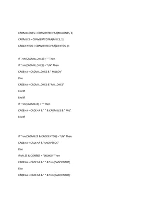 The document contains code for a function that converts a number to its word representation in Spanish. The function takes a number as input, breaks it into sections of thousands, hundreds, tens, and ones. It then uses select case statements to map each digit to its word equivalent in Spanish. The sections are combined with logic to handle exceptions like "11" mapping to "once" instead of "diez y uno". The function returns the full converted number as a string.