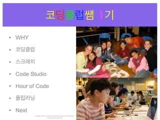 The document outlines the structure and activities of the 코딩클럽 (Coding Club), including sessions on creative computing, deep learning, and hackathons. It details the timeline of events from orientation to workshops and meetups. Collaborative learning and community-building within computer science education are emphasized throughout.