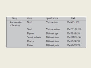 as codes of various materials kept in the stores.