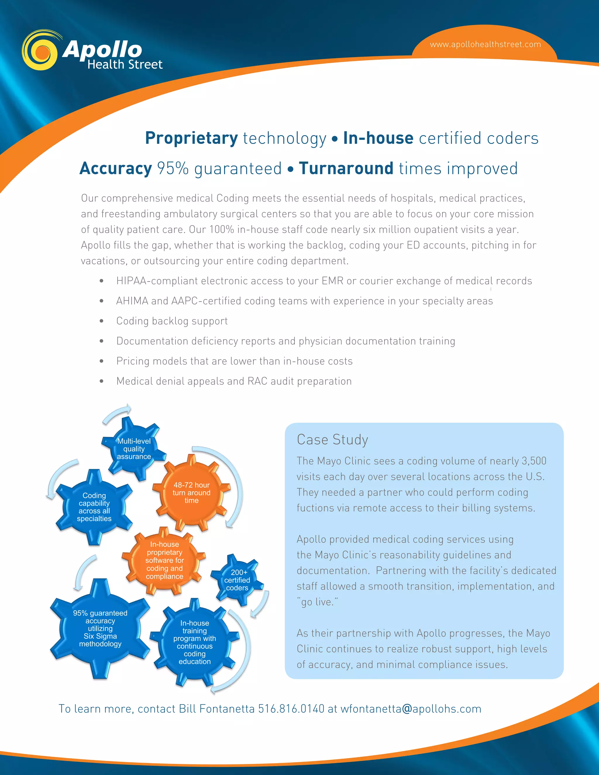 Apollo Health Street provides comprehensive medical coding and billing outsourcing services for hospitals, medical practices, and ambulatory surgical centers. Their proprietary technology and in-house certified coders can guarantee 95% coding accuracy. Their solutions include medical coding, electronic records access, coding backlog support, and appeals processing to fully handle the billing process for clients.