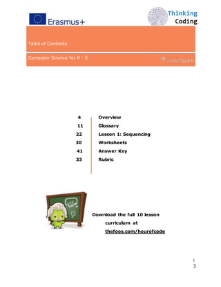 This document provides an overview of computer science lessons for grades K-5 using the game The Foos. It introduces foundational concepts like algorithms, sequences, and programming through puzzle levels that have students command characters to complete objectives. Lessons include both digital activities in the game and offline "unplugged" activities to reinforce sequencing skills without devices. The document outlines the curriculum and provides teaching tips, vocabulary definitions, and sample worksheets.