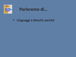 Il documento discute l'uso dei linguaggi di programmazione a blocchi, evidenziando la loro intuitività e accessibilità anche per chi non sa leggere. Viene sottolineato come questi linguaggi consentano di creare storie interattive, giochi e animazioni. Inoltre, si evidenzia il loro ruolo nell'insegnamento dei concetti base della programmazione e nello sviluppo del pensiero computazionale.