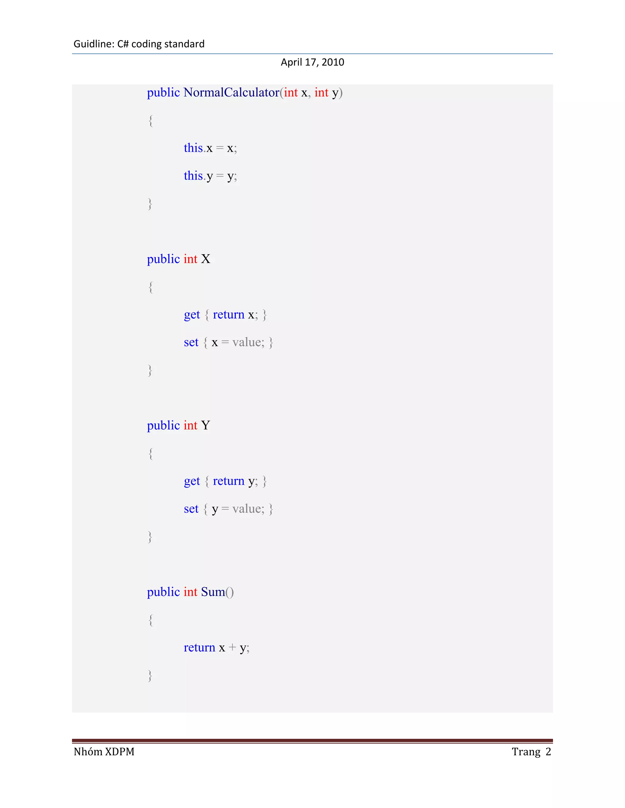 Tài liệu quy định chuẩn lập trình C# nhằm tối ưu hóa việc cộng tác trong nhóm và đảm bảo mã dễ hiểu. Nó bao gồm hướng dẫn về đặt tên, cách tổ chức tệp mã nguồn, và cách định nghĩa các thành phần như biến, phương thức và thuộc tính. Tài liệu cũng nhấn mạnh tầm quan trọng của việc tuân thủ các quy tắc này để cải thiện khả năng bảo trì và tương tác trong các dự án lớn.