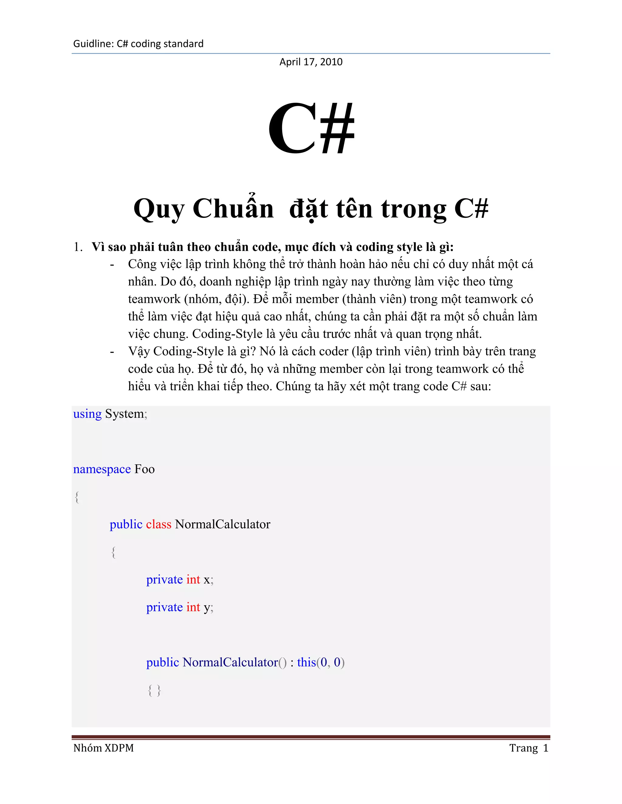 Tài liệu quy định các tiêu chuẩn lập trình C#, bao gồm cách đặt tên, phong cách mã hóa và tổ chức file. Mục tiêu chính là tạo điều kiện thuận lợi cho việc phát triển nhóm và duy trì mã nguồn hiệu quả. Các quy tắc cụ thể bao gồm quy tắc viết hoa, hình thức đặt tên biến, lớp, interface và các thành phần khác để đảm bảo tính nhất quán và dễ hiểu trong mã nguồn.