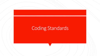 Coding standards provide guidelines for writing programs to make them easier to understand through unique and descriptive naming conventions, consistent indentation and spacing, and use of comments only where needed. Variables should be meaningfully named without abbreviations. Exceptions should specify the exact exception, and custom exceptions can be created; logging actual errors aids debugging. Methods should perform a single task with descriptive names and limited lines of code. Constants and empty strings replace hardcoding, and error messages help users. Files are logically organized with refactoring used for large files.