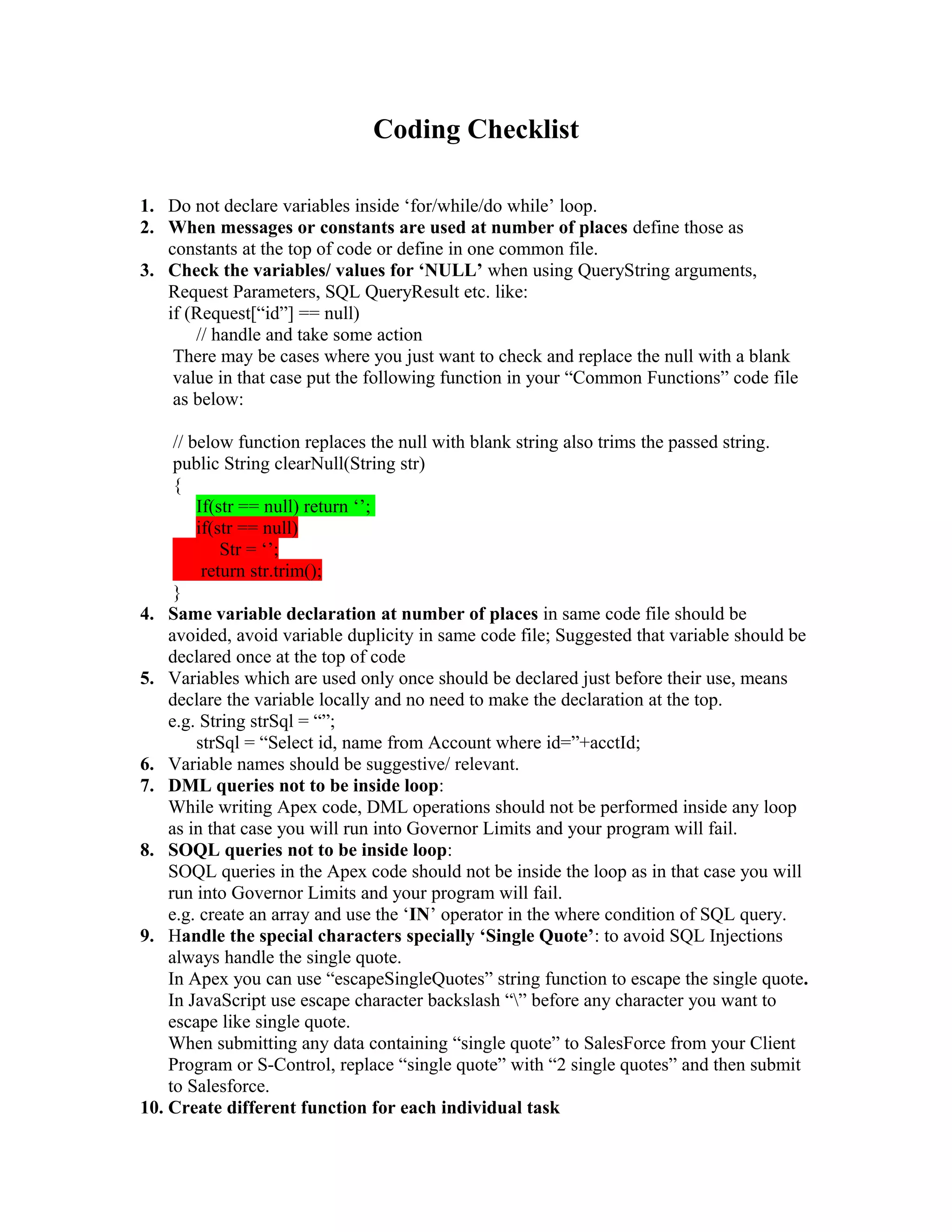 The coding checklist provides 14 guidelines for writing clean and optimized code in Salesforce, including avoiding declaring variables inside loops, handling null values, separating concerns into different functions, adding error handling with try/catch blocks, and using debug statements conditionally. It also recommends best practices for queries, DML statements, and special characters to avoid governor limit errors and security issues.