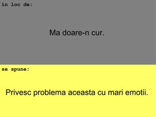 Documentul oferă un ghid pentru exprimarea adecvată a sentimentelor și frustărilor într-un mediu de birou, înlocuind exprimările vulgare cu formulări mai profesionalizate. Exemplifică modul în care comunicarea poate fi îmbunătățită, subliniind importanța menținerii unui ton respectuos. Recomandările se concentrează pe transformarea mesajelor negative în unele constructive.