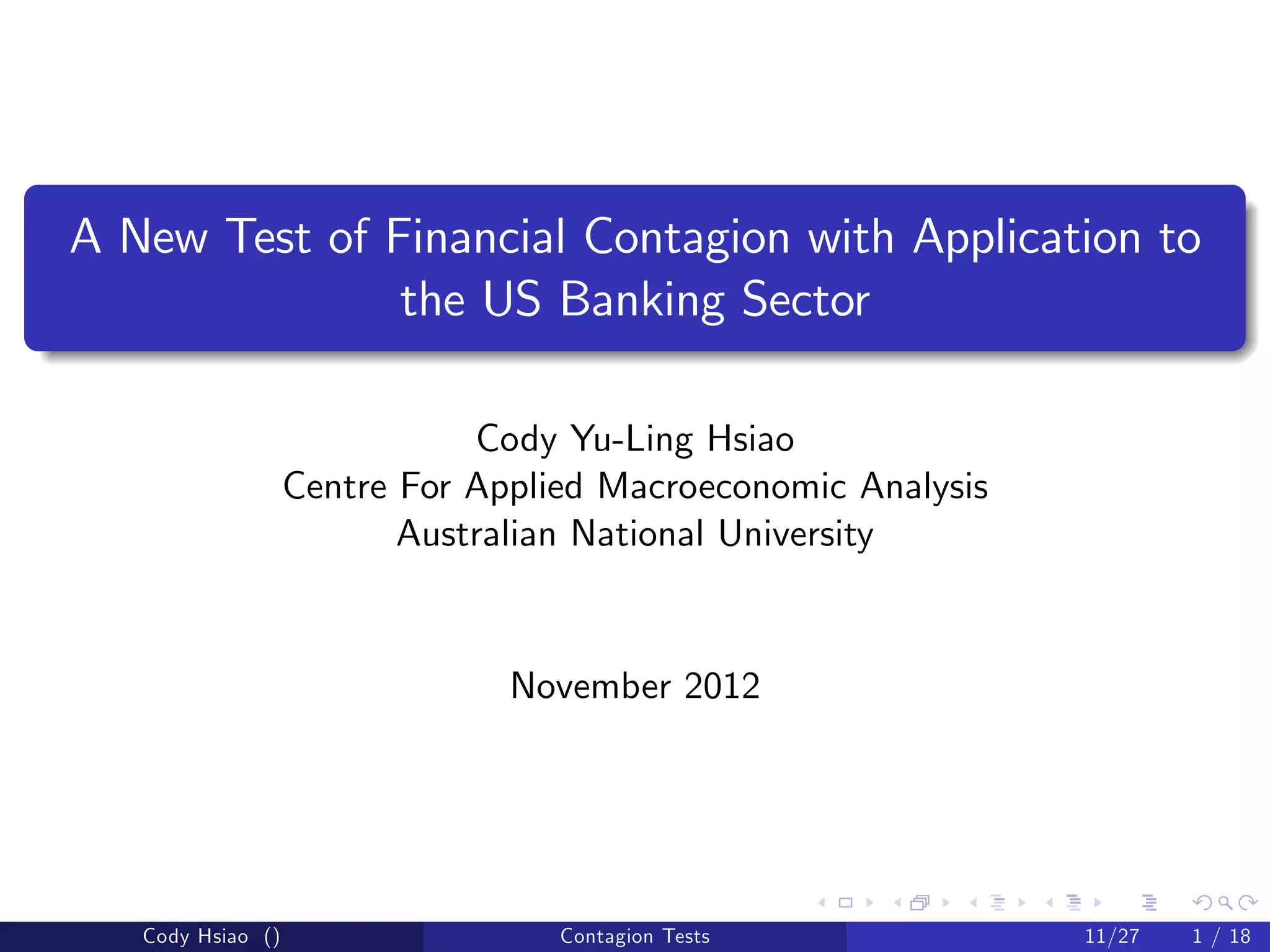 This document presents a new test for financial contagion based on changes in co-kurtosis and co-volatility between a non-crisis period and crisis period. The author applies this test to analyze contagion in the US banking sector during the 2008-2009 financial crisis. Specifically, the author 1) develops new statistics to measure extremal dependence through co-kurtosis and co-volatility, 2) applies these statistics to test for contagion from the US banking sector to other markets, and 3) finds significant contagion effects spreading from the US through these channels to global equity markets and banking sectors.