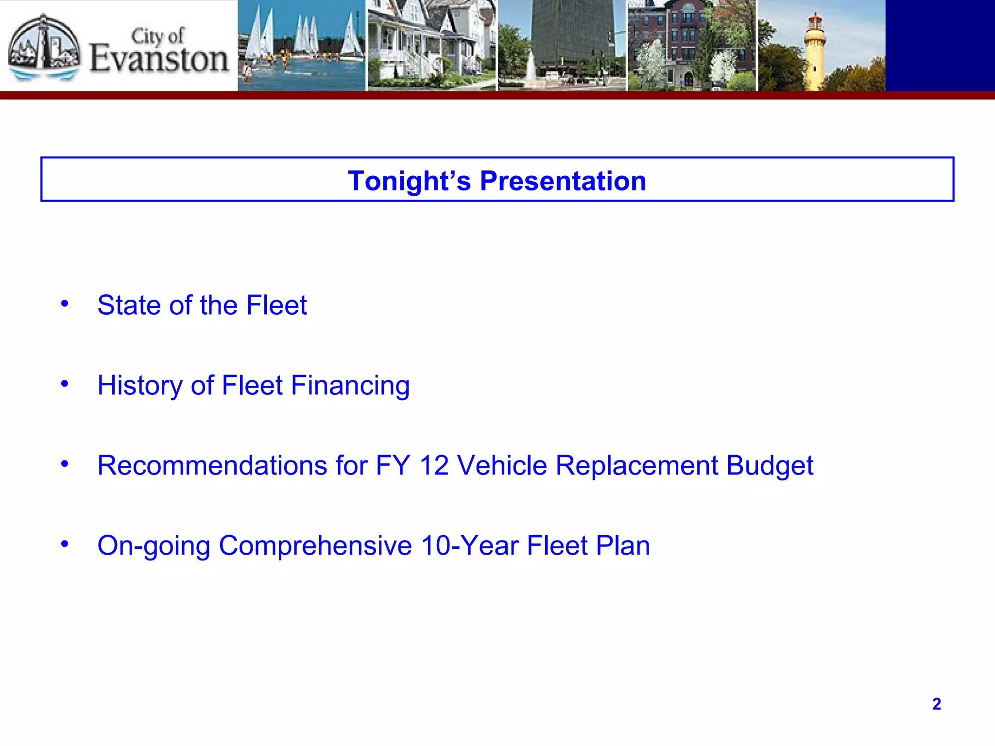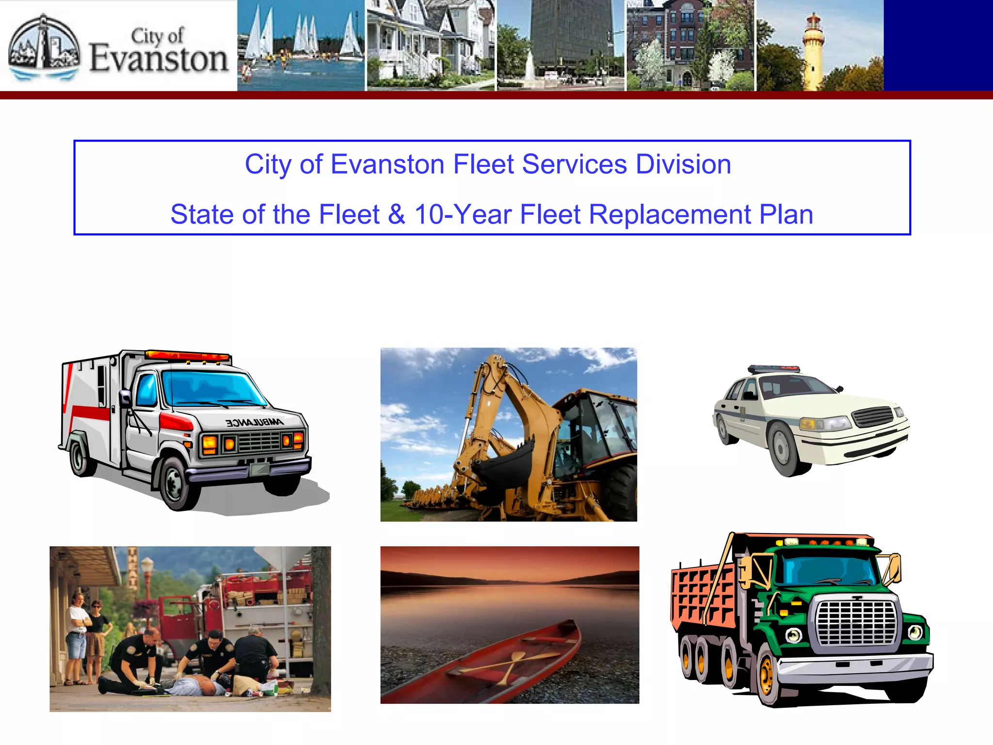 The document summarizes the state of Evanston's city fleet and provides a 10-year replacement plan. It finds that 151 vehicles are due or overdue for replacement, costing $10.2 million, but the FY12 budget only allows $3.5 million. To eliminate the backlog, the plan recommends increasing annual funding slightly over 10 years from $2.2 million to $2.1 million. This would reduce the backlog by half by 2016 and eliminate it entirely by 2019. The plan also suggests right-sizing the fleet and expanding equipment sharing to reduce costs.