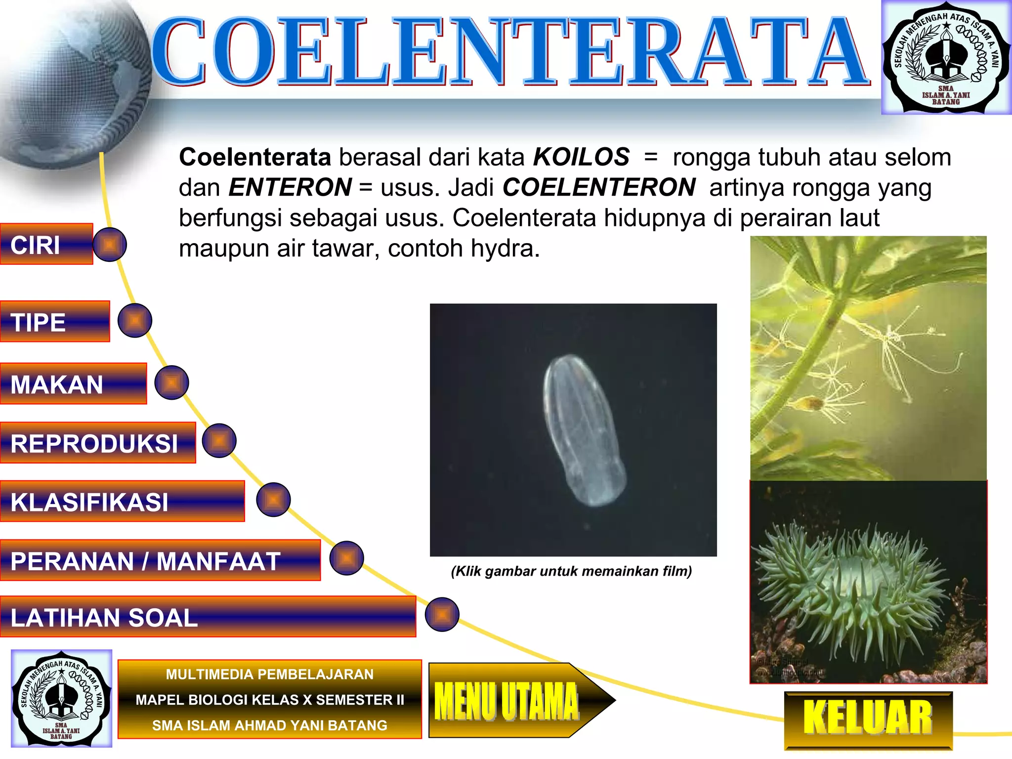 Coelenterata adalah hewan multiseluler dengan tubuh radial simetris, hidup di perairan laut dan tawar. Mereka memiliki fase polip dan medusa, memiliki sistem pencernaan gastrovaskuler, dan dapat bereproduksi secara aseksual serta seksual. Klasifikasi utama coelenterata terdiri dari empat kelas: Hydrozoa, Scyphozoa, Anthozoa, dan Ctenophora.