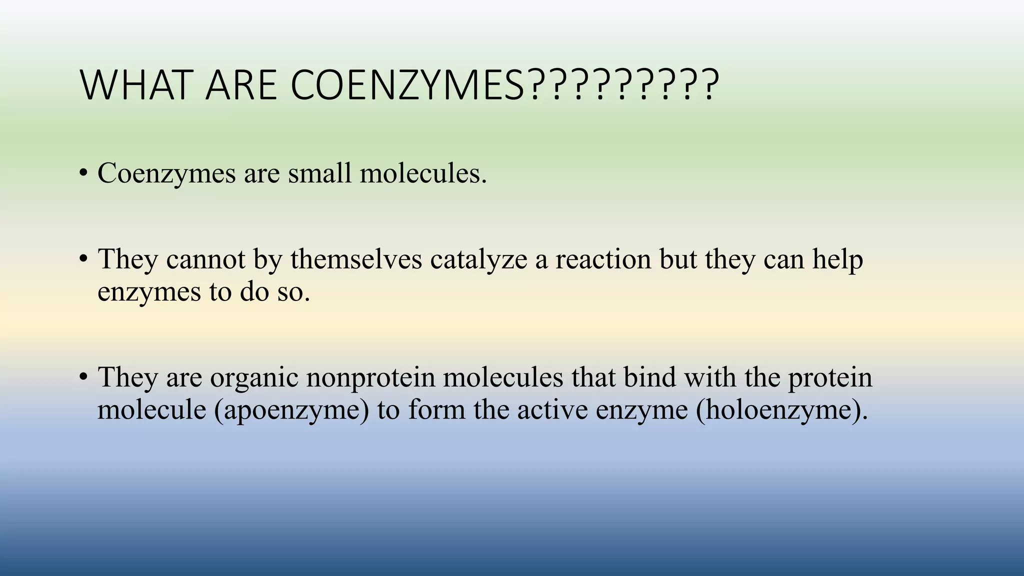This seminar presentation discusses the structure and function of coenzymes. Coenzymes are small organic molecules that bind to enzymes to help catalyze reactions. Many B vitamins act as coenzymes, facilitating the transfer of atoms between molecules during metabolism. Coenzymes bind to enzymes before other substrates and participate in redox, energy production, and transferring reactions. Deficiencies of certain coenzymes like niacin, riboflavin, pantothenic acid and vitamin B12 can cause diseases such as pellagra and megaloblastic anemia.