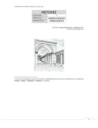 | το ρήμα coepi 2 ΕΠΙΜΕΛΕΙΑ : Θάνος Σταυρόπουλος – φιλόλογος, M.Sc. thanosstvropoulos@yahoo.gr i Οι τύποι του ρήματος αυτού που λείπουν αναπληρώνονται από τους αντίστοιχους του ρήματος incipio – incepi – inceptum – incipere 3 = αρχίζω . ΜΕΤΟΧΕΣ Ενεστώτας -- Μέλλοντας coepturus/a/um Παρακείμενος coeptus/a/um