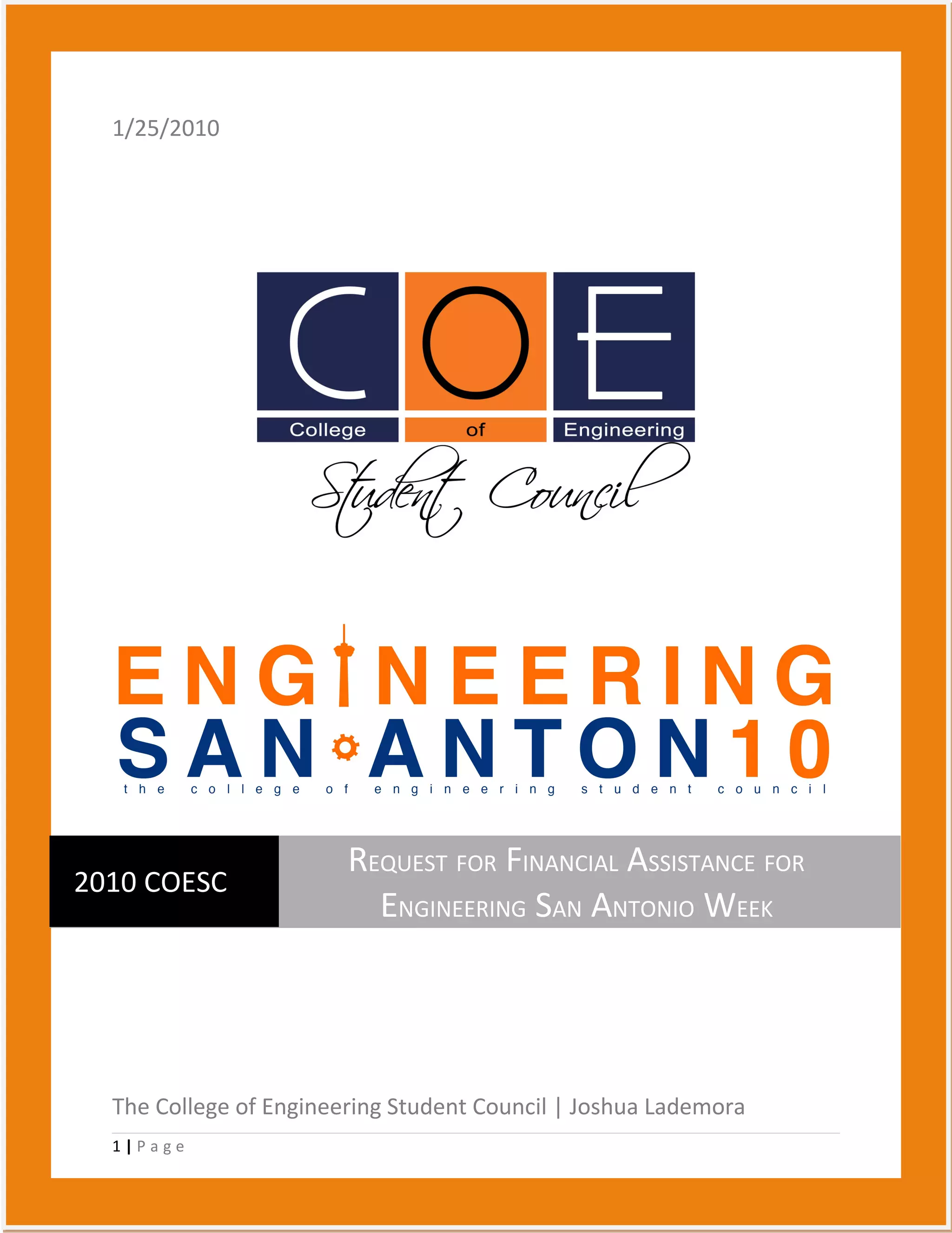 The COESC is requesting $6,445 in financial assistance to fund their upcoming 2nd annual Engineering San Antonio Week from March 22-26, 2010. The week-long event will feature various activities organized by 11 engineering student organizations to promote engineering to the UTSA campus. Events include an organization day, an integral t-shirt giveaway, a root beer celebration, an engineering fair with BBQ, and a formal engineering banquet. The funds would cover expenses like catering, supplies, equipment rental, banners, and awards for the events. Past sponsors of COESC events include Union Pacific Railroad, the UTSA College of Engineering, and local businesses.
