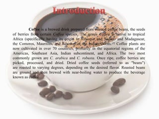 Coffee is prepared from roasted coffee beans that come from the seeds of Coffea species berries, native to Africa and Madagascar. Coffee plants are now cultivated in over 70 countries in tropical regions. The two most commonly grown species are Coffea arabica and Coffea robusta. Once picked, coffee berries are processed, dried, and the beans are roasted and brewed with hot water to produce coffee. While the earliest credible evidence of coffee drinking was in 15th century Yemen, according to legend Ethiopians were the first to recognize coffee's energizing effects.