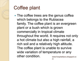 Coffee is naturally grown in many tropical and sub-tropical countries around the world. Ethiopia is considered the origin of coffee. There are several types of coffee plants, but the most common are Coffea arabica and Coffea canephora. Coffee is processed through either wet or dry methods depending on water availability. Popular brewing methods include instant, filter, percolator, espresso, and vacuum infusion. Factors like grind size, water temperature, and steeping time impact coffee quality and flavor.