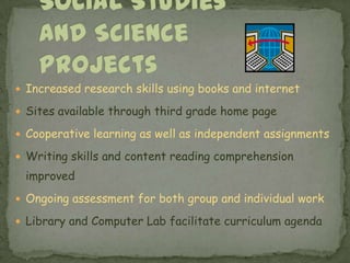 This document provides an overview of the curriculum for third grade at a school. It discusses that students will learn social studies and science through projects using books and online resources, with both individual and group work. It also mentions that writing, reading comprehension, and assessment of both group and individual work will be ongoing. The computer lab and library will support learning. Reading instruction will focus on shifting from learning to read to reading to learn using various genres. Spelling, language arts, grammar, math, and independent reading are also covered.