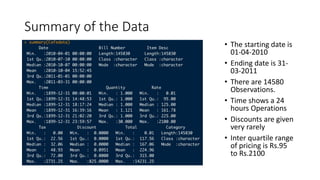 This document analyzes sales data from a coffee cafe between 2010-2011. It finds that food generates the most sales and discounts. Top selling food items include shakes and paninis, while beers and drafts are best sellers for liquor. Sales are highest on weekends and nights. The analysis identifies lower performing items and recommends combos and meals based on high selling items. RStudio and Tableau were used for the analysis.