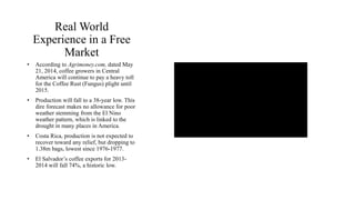 Coffee production in Central America will fall to historic lows in the next few years due to the spread of coffee rust fungus. Production in Costa Rica is expected to drop to its lowest level since 1976-1977. El Salvador's coffee exports for 2013-2014 fell 74%, which was also a historic low. The shortage of coffee from Central America will likely increase demand and prices for upscale coffee in other markets like the US. Factors like drought and disease that impact the supply of Central American coffee can shift the market equilibrium to lower quantities and higher prices. The efficient market theory developed by Eugene Fama suggests that markets quickly incorporate all available information, like the coffee supply issues, into asset prices like coffee prices.