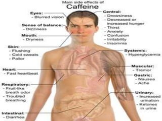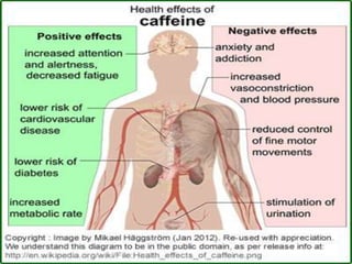 The document discusses several health effects of drinking coffee, noting that moderate coffee consumption is associated with reduced risk of depression and heart failure but may cause short-term increases in blood pressure, caffeine also acts as a mild appetite suppressant which could aid in weight loss when consumed in moderation along with a healthy diet and lifestyle. The overall message is that coffee in moderation is generally safe for most people but individuals should pay attention to how their body responds.