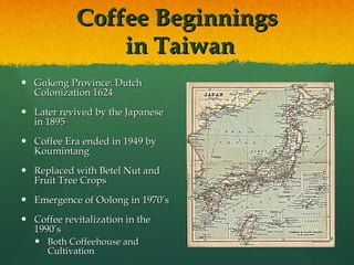 The document outlines the history and cultural evolution of coffee in Taiwan, highlighting its origins during Dutch and Japanese colonization, the rise of coffeehouses, and a resurgence in coffee culture in the 1990s. It discusses the impact of coffee on local economies, including shifts from tea cultivation to coffee beans, and the integration of coffee in Taiwan's social fabric through cafes and festivals. It also addresses challenges like high costs and the competition between domestic and imported coffee, positioning coffee as a significant element of Taiwan's agro-tourism industry.