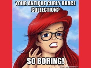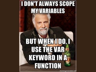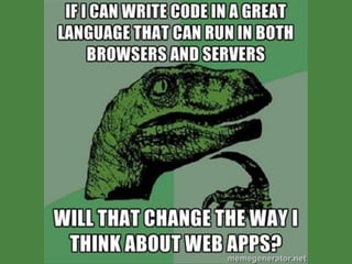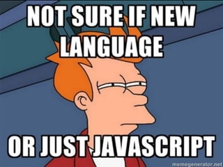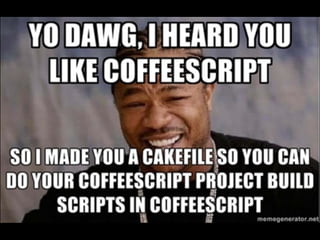 This document provides an overview of CoffeeScript design patterns. It discusses how CoffeeScript incorporates JavaScript best practices as defaults, such as using a wrapper to avoid variable scoping issues, proper indentation, and avoiding ==. It also covers built-in CoffeeScript patterns like classes, inheritance, and the prototype chain. The document discusses tools for compiling CoffeeScript and testing CoffeeScript code. It concludes by discussing the future of CoffeeScript and breaking boundaries between client and server.