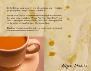 Coffee Stories is a community that brings people together through sharing stories about their coffee shop experiences. It started when Steve Kantor asked people to submit their coffee shop stories online, and hundreds of submissions poured in. These stories were compiled into a book and movie to share people's experiences. The organization now encourages people to continue sharing their coffee shop stories and ideas to bring more people together through their common experiences over coffee.