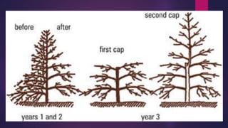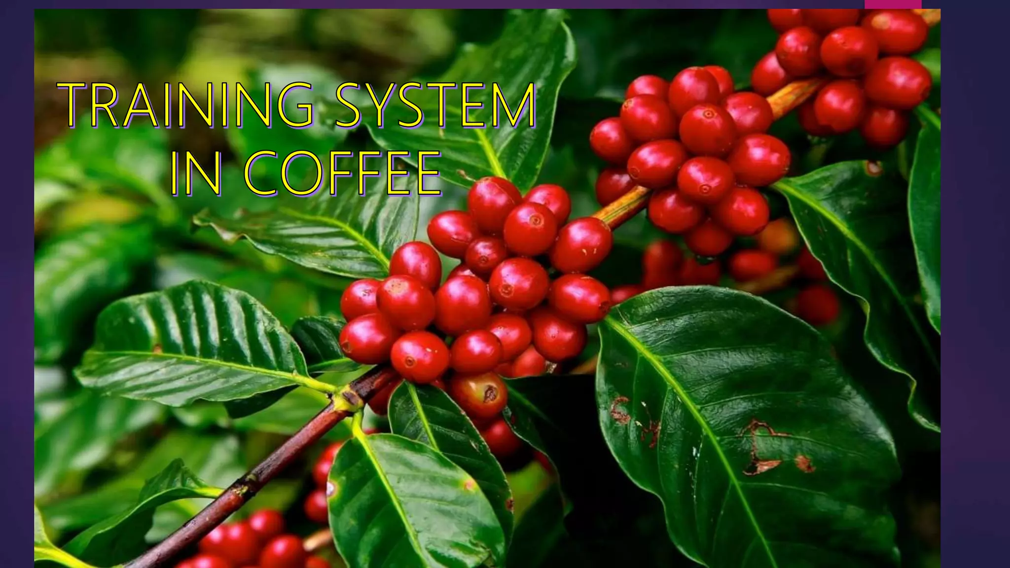 This document discusses the objectives and types of training for coffee plants. The main objectives of training are to admit sunlight and air into the center of the tree, direct growth for easier cultural operations, protect from damage, and promote balanced fruit production. The primary purpose of training is to restrict height for better management. Types of training discussed are single stem, where the main stem is topped to restrict height, and multiple stem, practiced in other countries by bending the main stem. Single stem is preferred in India as it provides a well-balanced structure and resistance to breakage. Varieties are topped at different heights based on their growth characteristics.