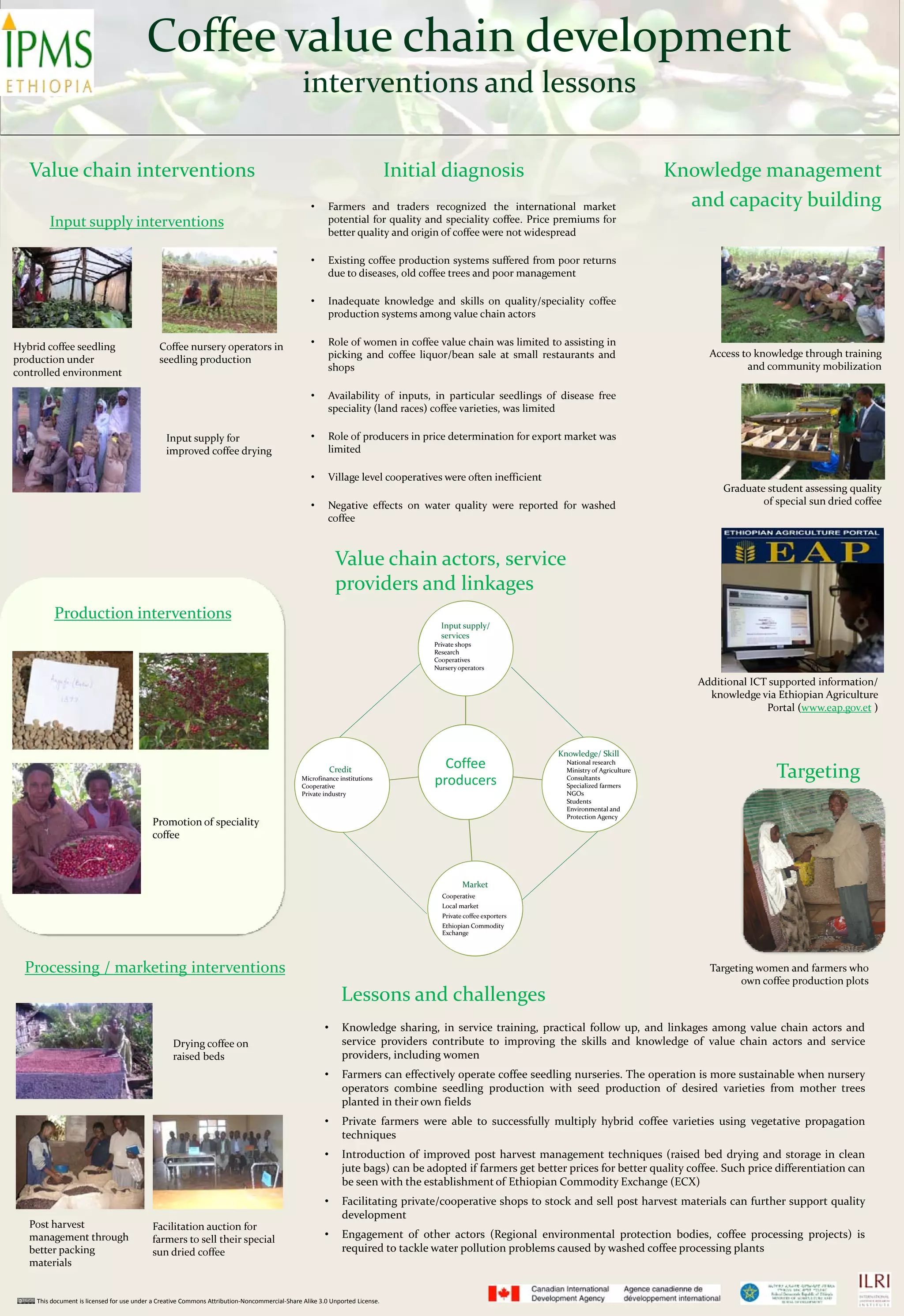 The document discusses the challenges and interventions in the coffee value chain, emphasizing the need for improved quality and market access for farmers and traders. Key issues identified include poor coffee production due to outdated practices and diseases, while opportunities exist through better training, disease-free seedlings, and improved post-harvest techniques. The active involvement of cooperatives and private actors is recommended for enhancing skills, creating efficient market linkages, and facilitating access to quality inputs.