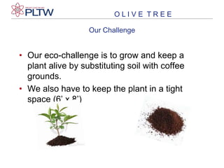 The document summarizes an eco-challenge project to grow and keep a plant alive using coffee grounds instead of soil. The group chose to grow African violets instead of potatoes due to time constraints. If they grew potatoes, they considered sending them to Haiti to help with food shortages caused by earthquakes. The document provides instructions for growing a plant using coffee grounds, including using 4 cups of grounds per square foot and watering daily.