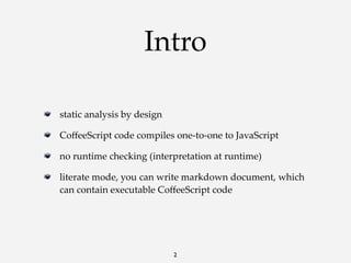 The document discusses CoffeeScript, a programming language that compiles to JavaScript and emphasizes concise syntax and significant whitespace. It covers features like function definitions, loops, mixins, and its compatibility with JavaScript frameworks like AngularJS, while also providing examples and performance comparisons. Given its growing popularity, the document encourages developers to adopt CoffeeScript for improved coding efficiency.