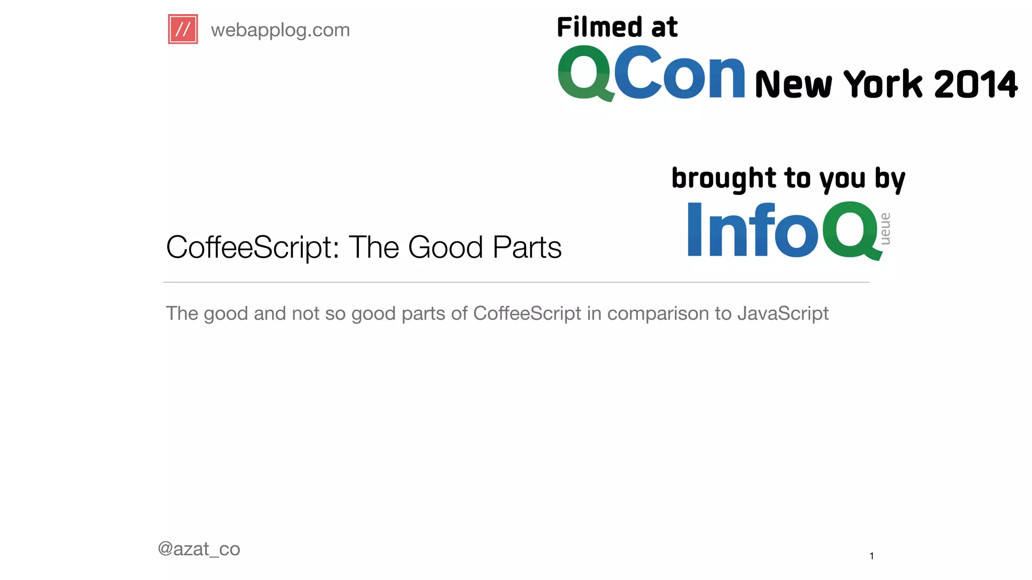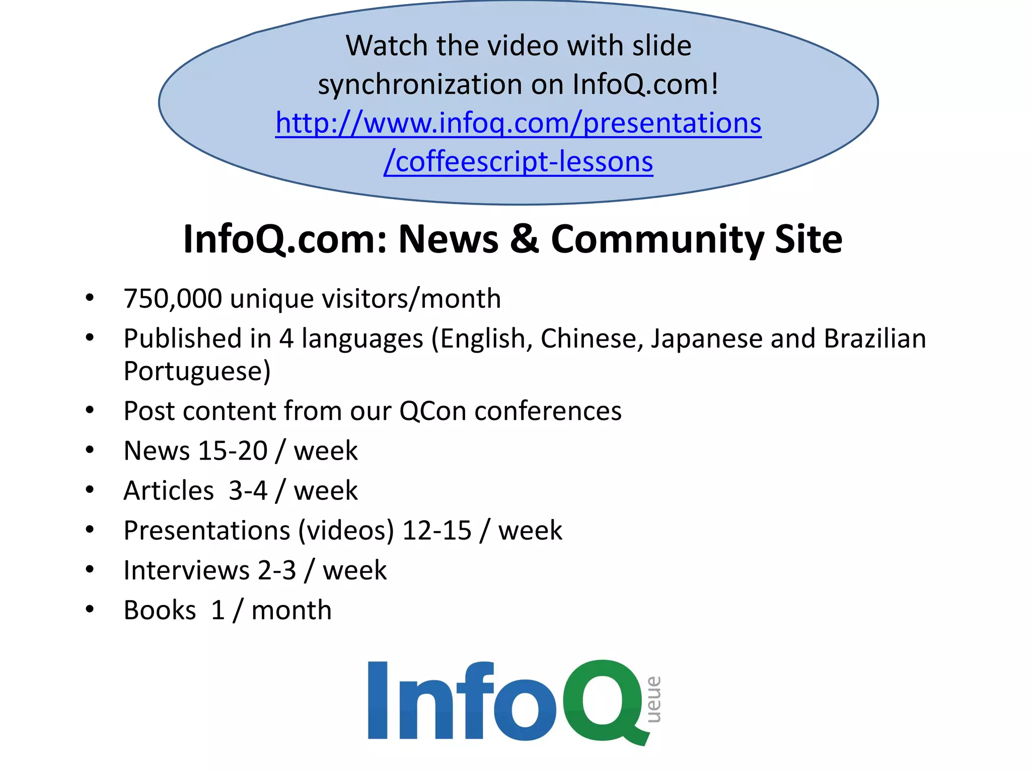 The document discusses the advantages and disadvantages of CoffeeScript compared to JavaScript, highlighting its syntactic simplicity, scoping improvements, and class declarations. It includes personal reflections from the presenter, Azat Mardan, along with examples showing how CoffeeScript can enhance productivity for developers. Furthermore, the document mentions notable companies that utilize CoffeeScript and suggests resources for further learning.
