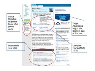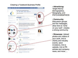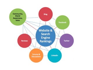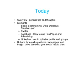The document provides an overview of integrating various social media platforms and strategies for businesses to utilize social media effectively. It discusses platforms like Twitter, Facebook, LinkedIn and tips for using each one. It also provides examples of how companies are using social media successfully through fan pages, groups, contests and engaging communities. General strategies mentioned include automating updates, engaging conversations and focusing on quality over quantity of interactions.