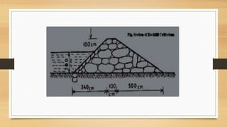 A cofferdam is a temporary structure used to keep water or soil out of an excavation for construction. It must be watertight but does not require absolute water tightness, and various materials like earth, timber, steel, and concrete can be used depending on factors such as depth and soil condition. Different types of cofferdams include dikes, single wall, double wall, cellular, rock-filled crib, and concrete, each having unique construction methods and applications.