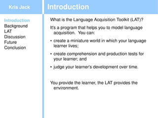 The Language Acquisition Toolkit (LAT) is a computational tool designed for modeling child language acquisition by providing a simulated environment where learners can be trained and tested on their language skills. It allows the creation of comprehension and production tests, assesses language development over time, and aims for standardization and time-saving benefits in language acquisition studies. The LAT framework includes training, testing, and analysis components to facilitate a holistic approach to understanding language learning progress.