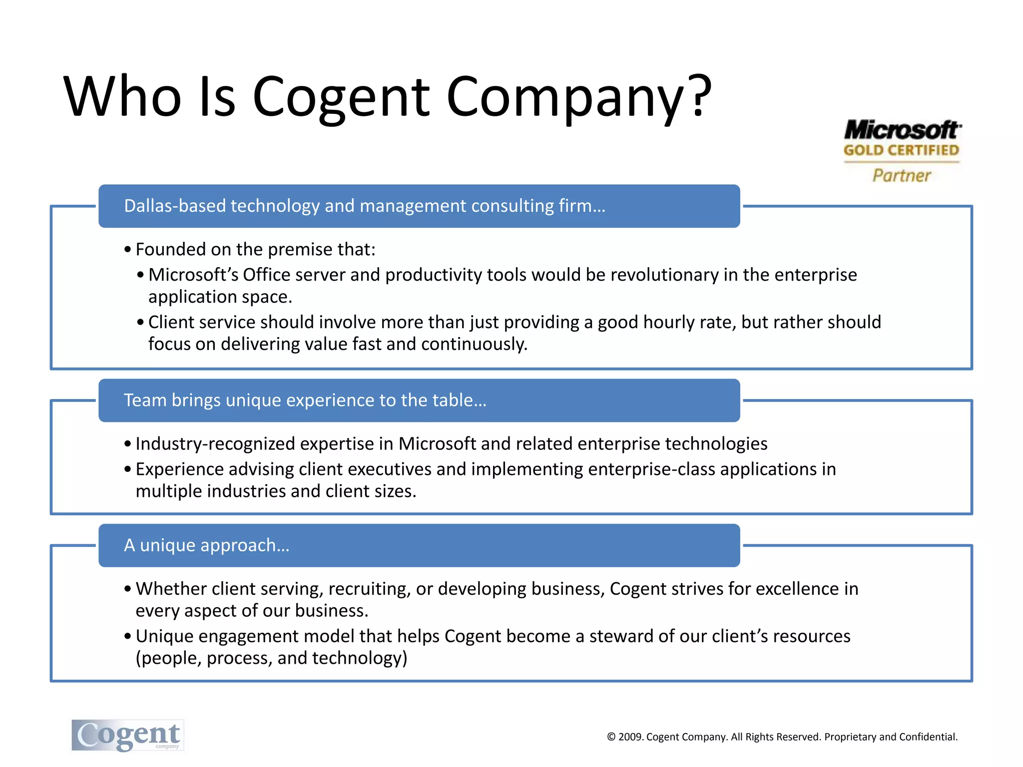 Cogent Company is a technology and management consulting firm based in Dallas, focused on delivering value through Microsoft's enterprise solutions and continuous client service. They offer a range of services including infrastructure optimization, identity management, application development, and business productivity enhancements, all underpinned by a unique engagement model. Their experience spans various industries, evidenced by successful implementations for Fortune 50 companies and an emphasis on improving technology adoption within organizations.