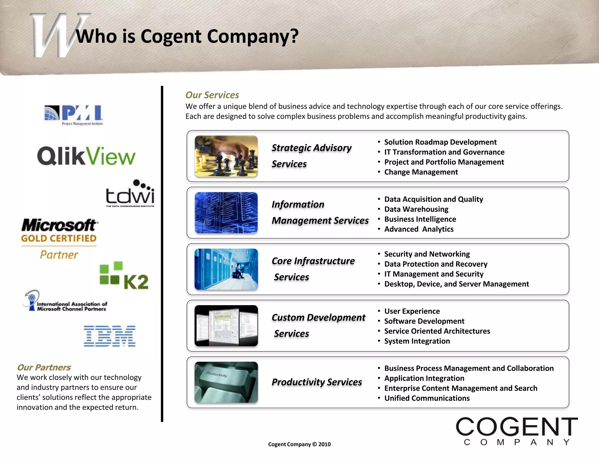 Cogent Company is an IT and management consulting firm that specializes in helping clients solve business problems through technology solutions. The document describes three success stories where Cogent helped clients: