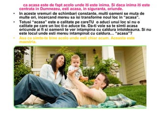 Documentul transmite un mesaj de încurajare, evidențiind că 'acasă' este o stare a inimii și nu un loc fizic, sugerând că fericirea este o alegere care depinde de atitudine. Se face apel la iubire, toleranță și reconectarea cu sine, afirmând că fiecare zi este o nouă oportunitate de a deveni o versiune mai bună a sinelui. De asemenea, subliniază importanța ajutorului reciproc și a încrederii în viață, revelând că există o soluție pentru orice problemă.
