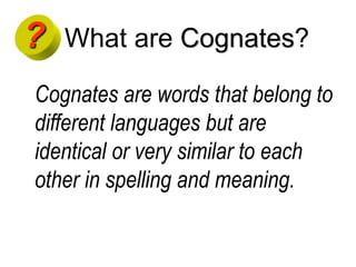Cognates are words that belong to different languages but are identical or very similar in spelling and meaning. Some words appear to be cognates but are actually false cognates with different meanings across languages. Other words can have multiple meanings depending on context and are considered part-time cognates. The document provides examples of cognates, part-time cognates, and false cognates between Spanish and English.