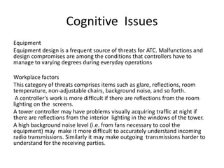 The document discusses several psychosocial factors that can impact air traffic controllers' work. It notes that social support is important for stress management, including availability of services to meet needs and recognition of the importance of their work. It also discusses how controllers feel a need to see their profession as honorable and indispensable due to a lack of external recognition from the public. The excerpt provided discusses research finding that Swiss controllers emphasized descriptions of their work as specialized, honorable, and irreplaceable to make up for a lack of public understanding or perception that their work causes delays.