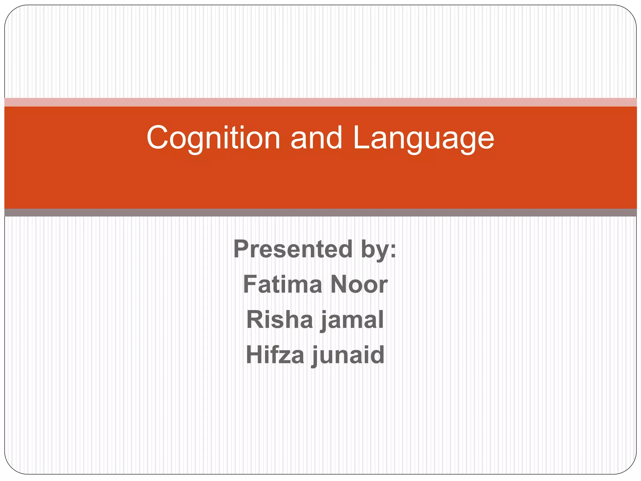 This document provides an overview of cognition and language from a cognitive psychology perspective. It discusses three main topics: thinking and reasoning, problem solving, and language. For thinking and reasoning, it describes mental images and concepts. For problem solving, it outlines the three steps of problem solving and discusses various problem solving strategies and challenges. For language, it discusses the elements of language including grammar, language development from babbling to age 5, theories of language acquisition, the influence of language on thinking, and issues around bilingualism.