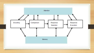 The document discusses various aspects of cognition including how information is processed through encoding, storage in memory, response selection, and response execution. It also covers cognitive models which are used by cognitive psychologists to predict human behavior and can help computer designers understand how users will interact with systems. The document outlines several cognitive processes like attention, perception, memory, learning, and problem solving and discusses design implications for supporting these processes.
